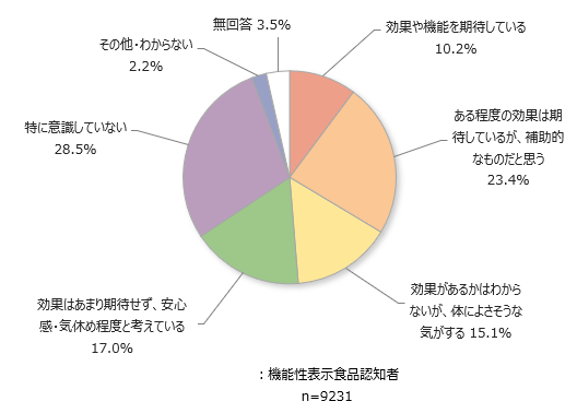 「効果があるかはわからないが、体によさそうな気がする」「効果はあまり期待せず、安心感・気休め程度と考えている」は各1割台半ば~後半、「特に意識していない」が28.5%となっています。