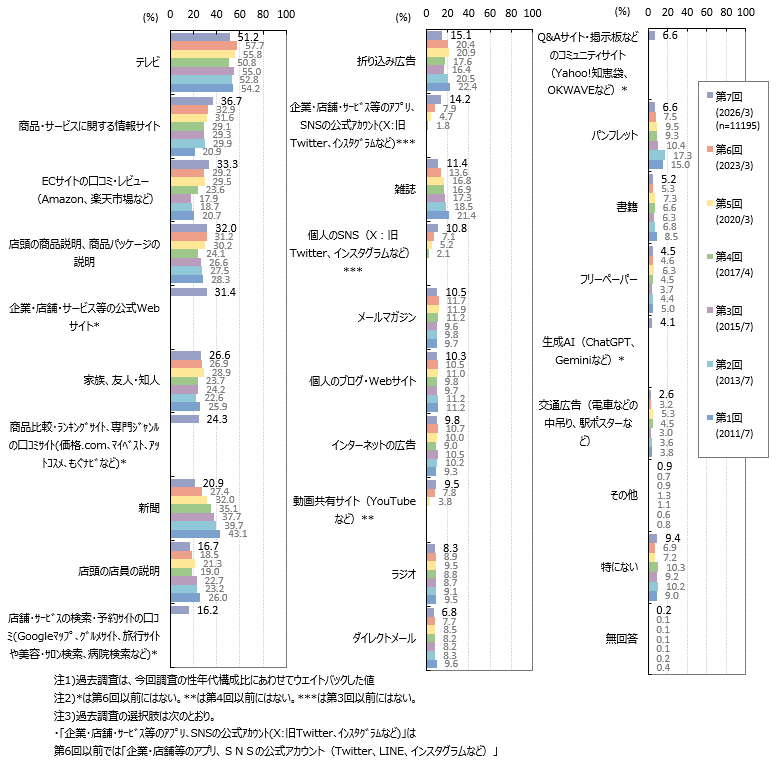 商品・サービス購入・利用時に重視する情報源は「テレビ」51.2%、「商品・サービスに関する情報サイト」36.7%、「ECサイトの口コミ・レビュー(Amazon、楽天市場など)」「店頭の商品説明、商品パッケージの説明」「企業・店舗・サービス等の公式Webサイト」各3割強です。