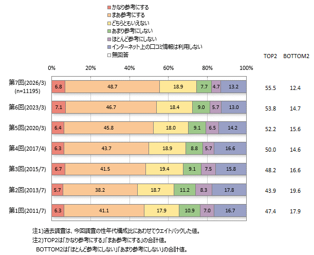 商品・サービスの購入・利用時にネット上の口コミ情報を参考にする人(「かなり参考にする」「まあ参考にする」の合計)は、全体の約56%です。2013年以降微増傾向となっています。
