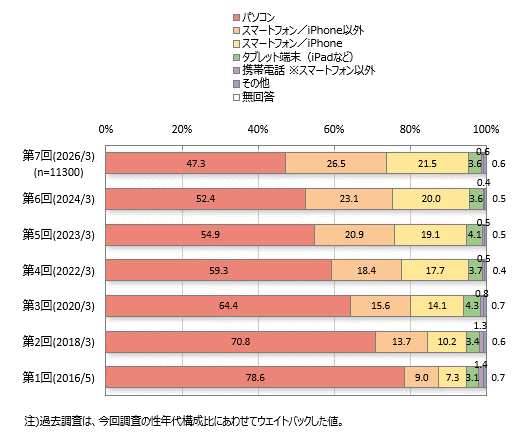 個人でWebサイトやアプリ等のインターネットを閲覧・利用する際、最もよく利用する機器は「パソコン」が47.3%、スマートフォンは5割弱です。