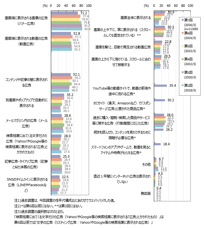 直近1年間のインターネット利用時に表示されたインターネット広告は、「画面端に表示される画像の広告(バナー広告)」が71.2%、「画面端に表示される動画の広告(動画広告)」「コンテンツや記事の間に表示される広告」が各5割強です。