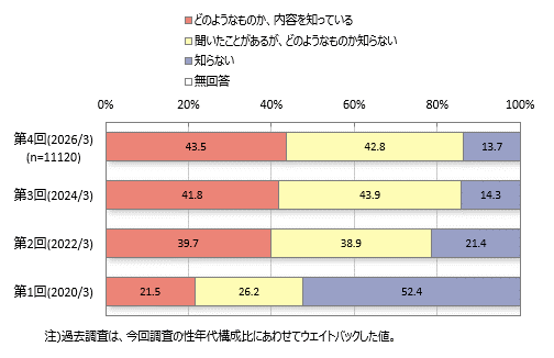 「どのようなものか、内容を知っている」は男性の方がやや比率が高く、「聞いたことがあるが、どのようなものか知らない」は女性の方がやや高くなっています。