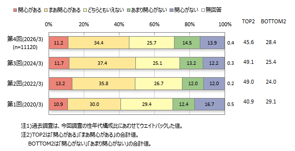サステナビリティへ関心がある層(「関心がある」「まあ関心がある」の合計)は4割台半ば、関心がない層(「あまり関心がない」「関心がない」の合計)は3割弱です。