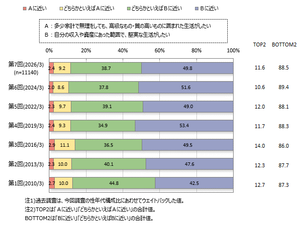 「A:多少家計で無理をしても、高級なもの・質の高いものに囲まれた生活がしたい」「B:自分の収入や資産にあった範囲で、堅実な生活がしたい」のどちらに近いかをたずねたところ、Bに近い人(「Bに近い」「どちらかといえばBに近い」の合計)が9割弱を占めます。