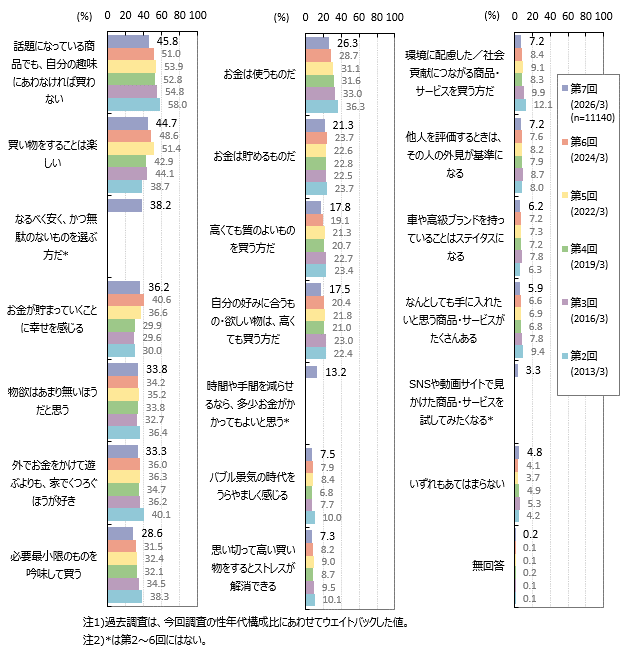 「話題になっている商品でも、自分の趣味にあわなければ買わない」「買い物をすることは楽しい」が各4割台半ば、「なるべく安く、かつ無駄のないものを選ぶ方だ」「お金が貯まっていくことに幸せを感じる」が各4割弱、「物欲はあまり無いほうだと思う」「外でお金をかけて遊ぶよりも、家でくつろぐほうが好き」などが約33~34%です。過去調査と比べ「お金は使うものだ」などが減少傾向です。