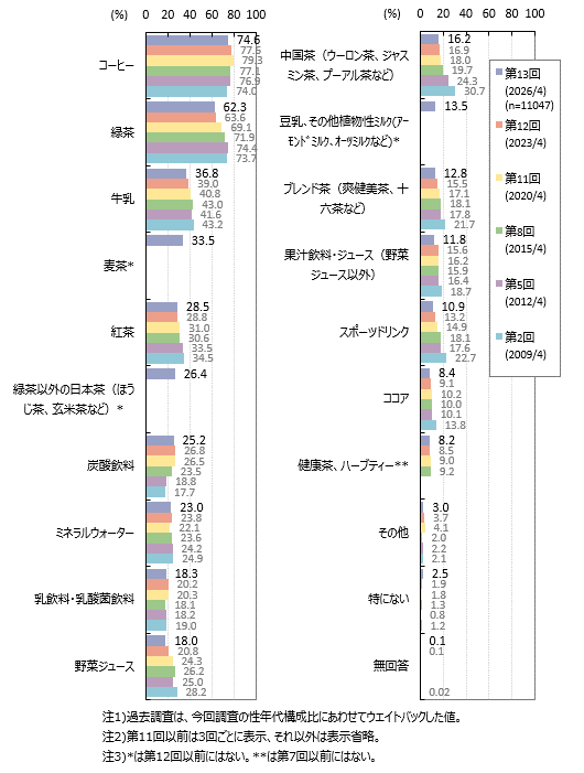 普段よく飲む飲み物は、「コーヒー」74.6%、「緑茶」62.3%が上位2位、「牛乳」「麦茶」各30%台、「紅茶」「緑茶以外の日本茶(ほうじ茶、玄米茶など)」各3割弱です。