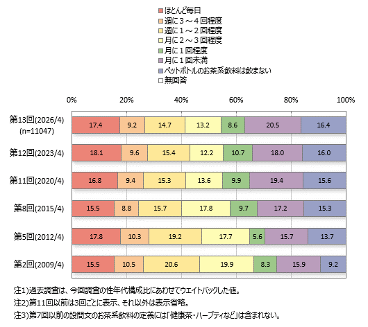 【Q2.(全員)あなたは、ペットボトルのお茶系飲料をどのくらいの頻度で飲んでいますか。緑茶、日本茶、麦茶、中国茶、ブレンド茶、健康茶、紅茶など(茶葉が原料のもの)をすべて合わせた頻度をお聞かせください。】