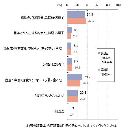 「市販の、米粉を使った食品・お菓子」が34.3%、「自宅で作った、米粉を使った料理・お菓子」「飲食店・喫茶店などで食べた(テイクアウト含む)」が約8~9%となっています。
