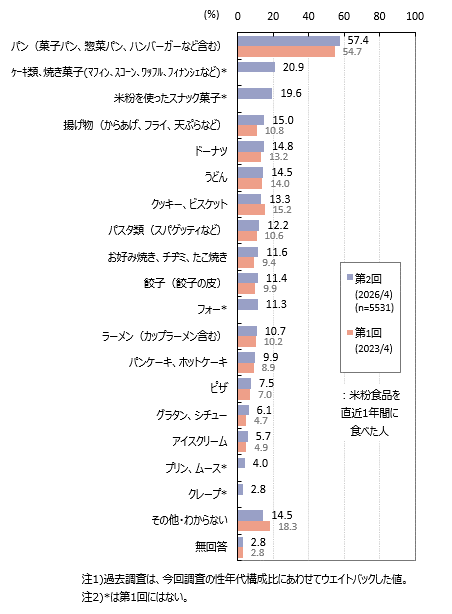 米粉の食品・料理を直近1年間に食べた人のうち「パン」を食べた人は57.4%です。以下「ケーキ類、焼き菓子(マフィン、スコーン、ワッフル、フィナンシェなど)」「米粉を使ったスナック菓子」各2割前後、「揚げ物(からあげ、フライ、天ぷらなど)」「ドーナツ」「うどん」がそれぞれ約15%となっています。