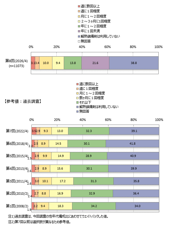 【Q1.(全員)あなたはどのくらいの頻度で解熱鎮痛剤を利用していますか。市販、処方薬をあわせてお聞かせください。】