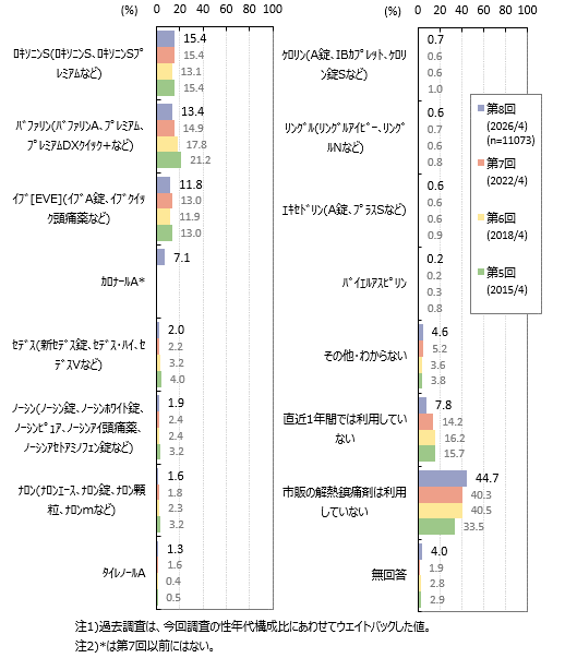 利用している解熱鎮痛剤は「ロキソニンS」「バファリン」「イブ」が上位3位で、各1割強~1割台半ばです。