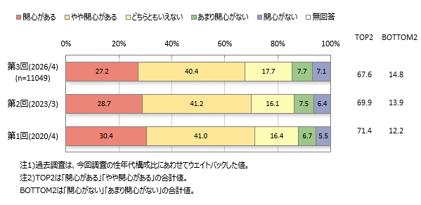■環境問題の関心度は7割弱で、高年代層で多い。過去調査と比べて減少傾向。