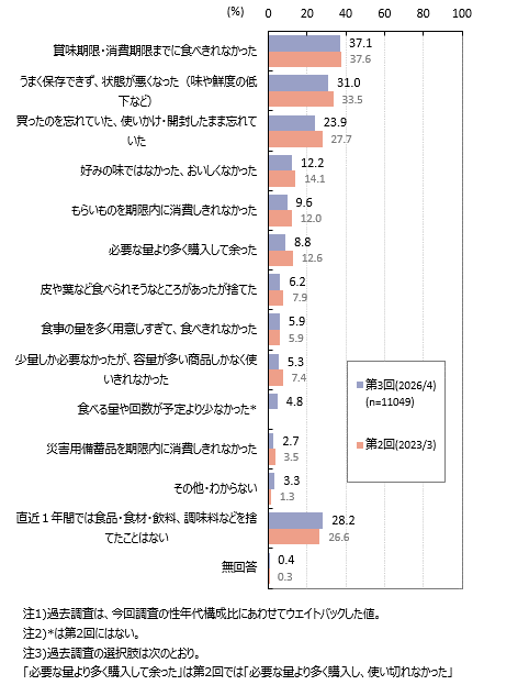 直近1年間に、食品・食材などが食べられるのに捨てた場面・理由は、「賞味期限・消費期限までに食べきれなかった」37.1%、「うまく保存できず、状態が悪くなった(味や鮮度の低下など)」31.0%、「買ったのを忘れていた、使いかけ・開封したまま忘れていた」23.9%です。