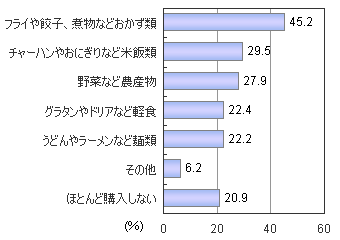 「フライや煮物などのおかず類」(45%)が最も多く、以下「チャーハンなどの米飯類」(30%)、「野菜などの農産物」(28%)と続きます。