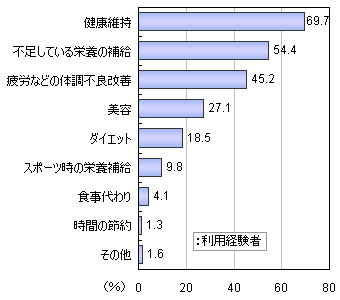 「健康維持」(70%)がトップで、「不足している栄養の補給」(54%)、「疲労などの体調不良改善」(45%)が続いています。
