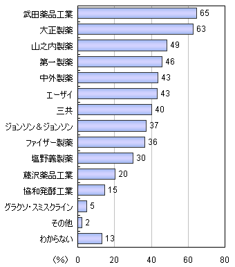 「武田薬品」(65%)、「大正製薬」(63%)が上位2位を占めています。