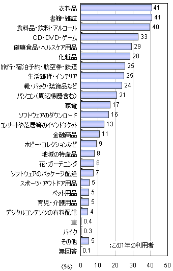 「衣料品」、「書籍・雑誌」、「食料品・飲料・アルコール」が各4割で上位3位を占めています。