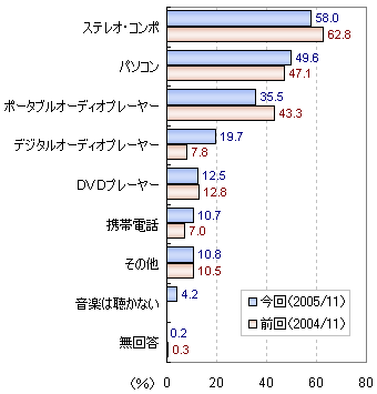 「ステレオ・コンポ」(58.0%)が最も多く、「パソコン」(49.6%)、「ポータブルオーディオプレーヤー」(35.5%)が続きます。前回(2004年11月)と比較すると、「デジタルオーディオプレイヤー」の利用が増加しています。
