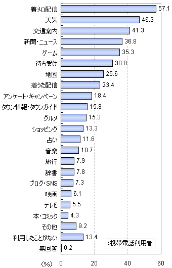コンテンツ全体の利用経験は8割超で、内容の上位3位は「着メロ配信」(57.1%)、「天気」(46.9%)、「交通案内」(41.3%)です。